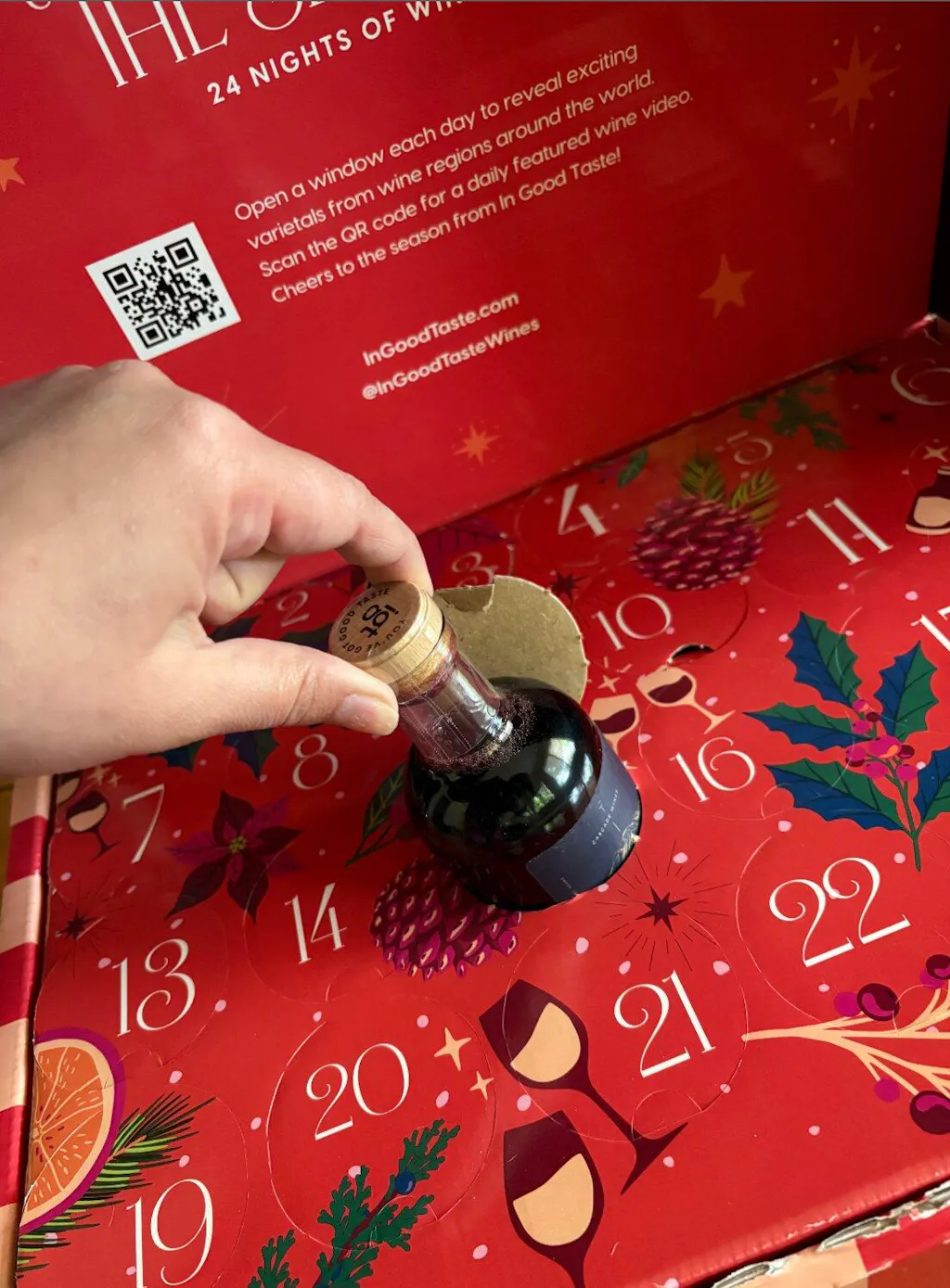 Boy, if you want to enjoy some of the Best wines Ever, buy the Advent Calendar next year! You will not be disappointed!! Most wines give me a headache or just don't agree with me, but In Good Taste offer quality wine. No issues with them.